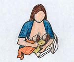 Following are some drawings and photos which demonstrate a variety of positions for simultaneous breastfeeding of two babies/toddlers through a combination of holds: cradle holds, football holds, one lying down and then in a saddle hold while the little ones sit on Momma’s knees. Finding what works for you and your babies will make things run smoothly. Keep in mind that as the babies grow, by necessity, you may need to look trying other positions.